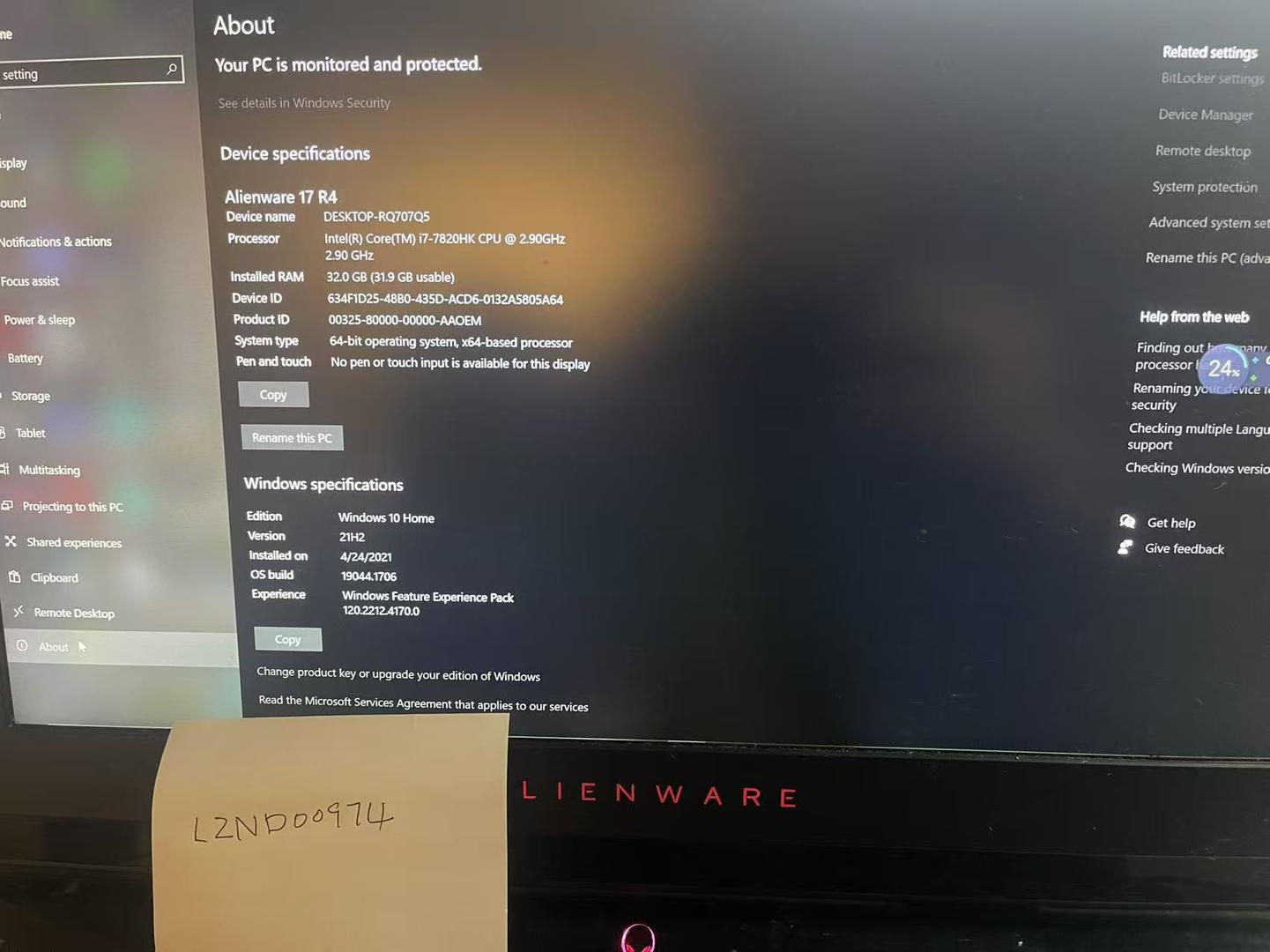 Intel Core i7 - 7820HK CPU @2.9 GHz installed RAM 32 GB