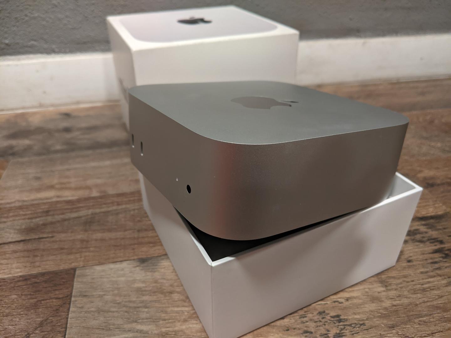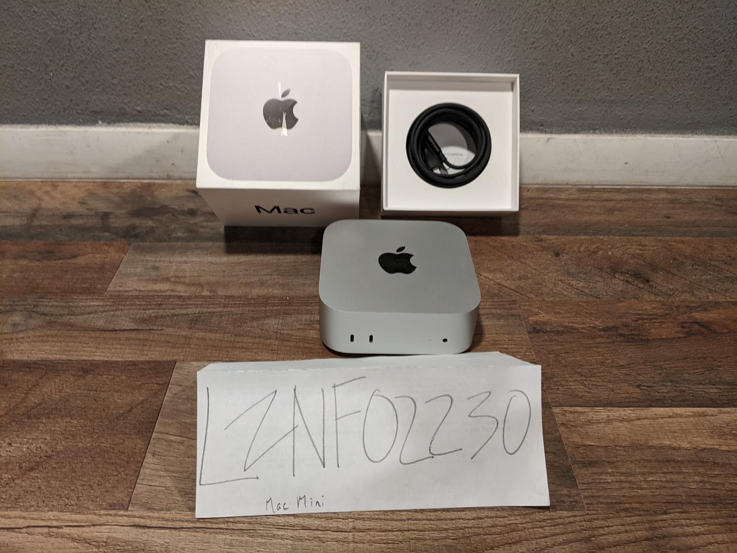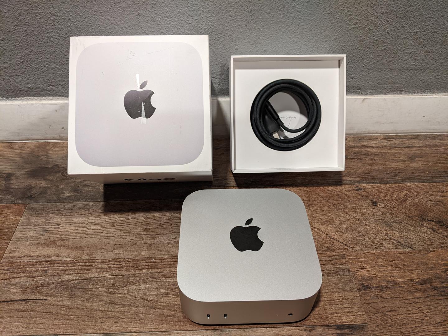 This is a new, open box return Mac Mini. It's in mint condition and includes the original box, power cord, and documentation. The box shows minor wear.
