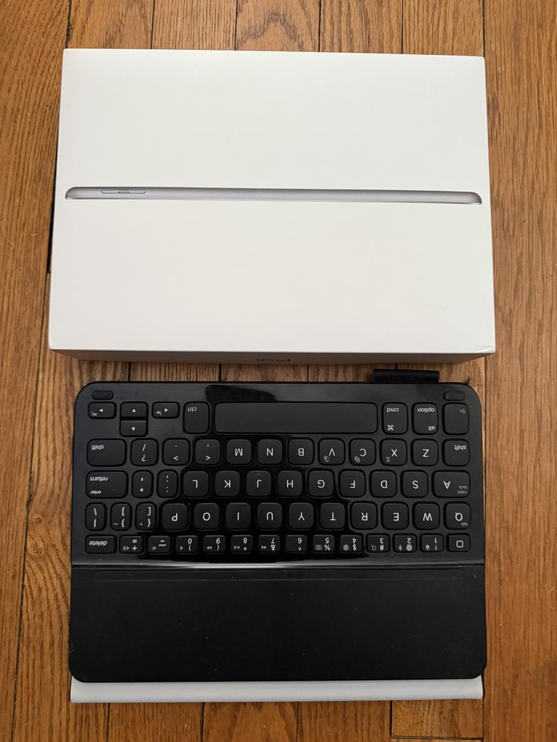 Comes with original packaging, 12 watt charger, 2 cables, bluetooth keyboard/case(keyboard works but the case is a little funky.