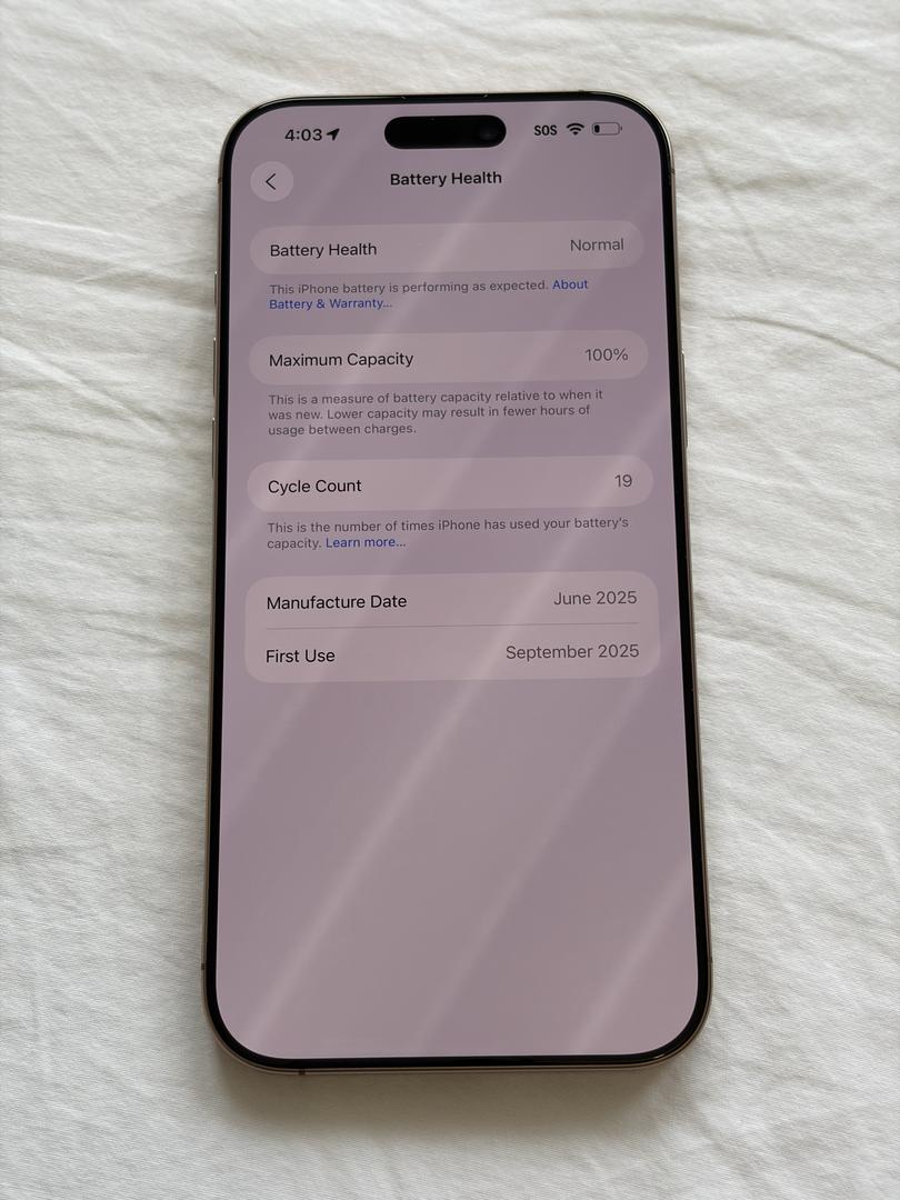 100% Battery Health, ~19 Battery Cycle Count.