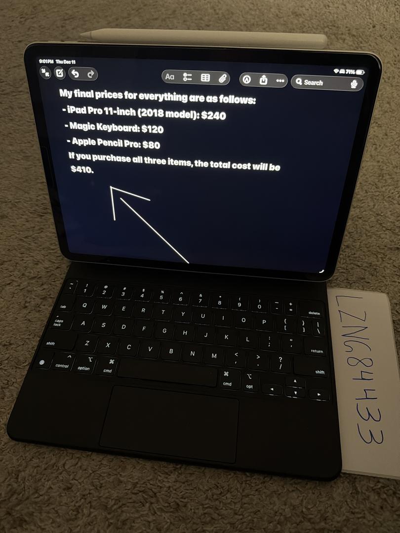If you purchase everything I can offer for $400, you’ll get an iPad Pro 11-inch model from 2018, an Apple Magic Keyboard for iPad Pro, and an Apple Pencil Pro.