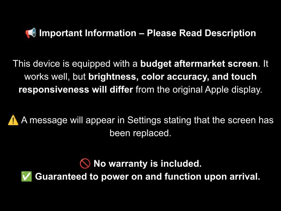 The device is in good condition with light signs of use. The screen may have small scratches or faint marks, only noticeable upon closer inspection and not affecting performance. This device is equipped with a budget aftermarket LCD screen. Please view photo #2 for more information.