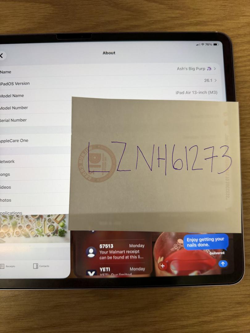 iPad Air 13 inch 256gb in purple with screen protector