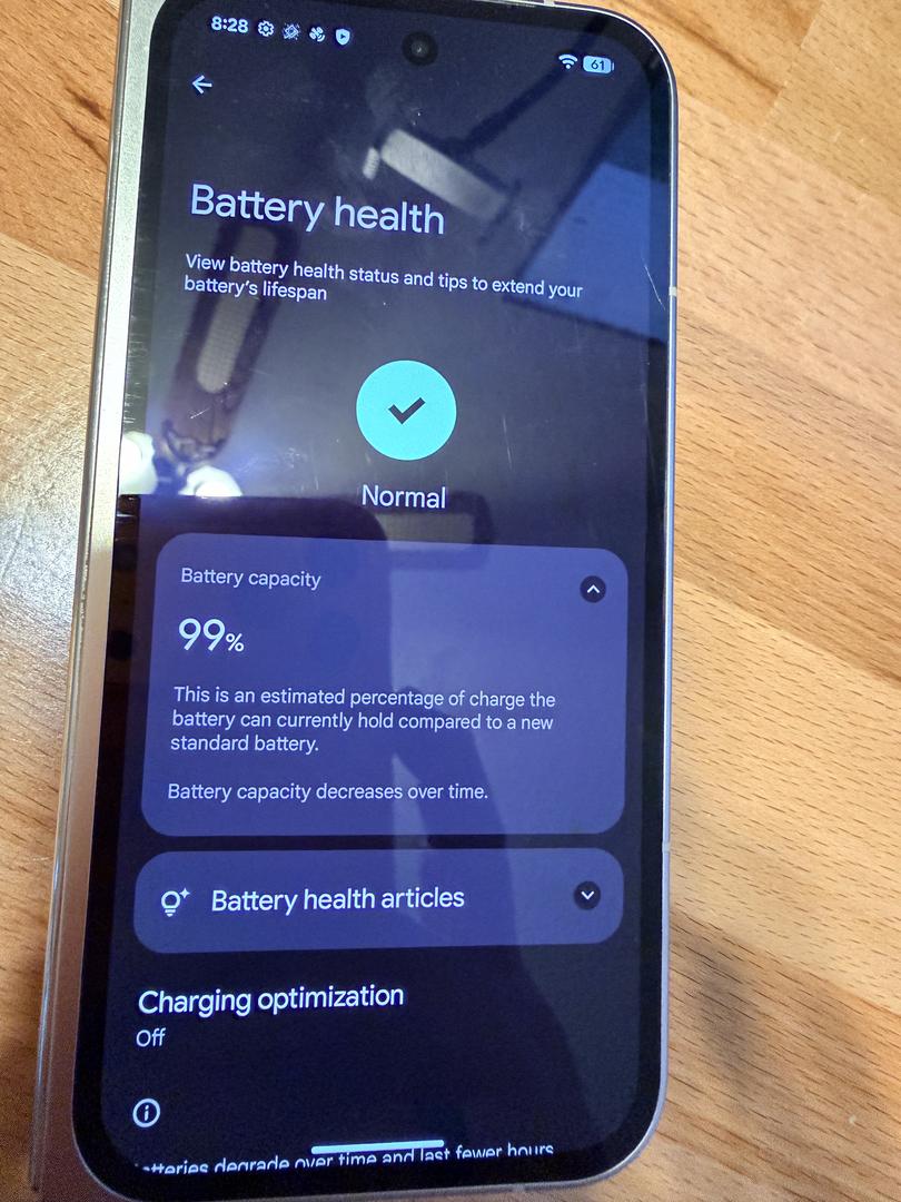 Battery capacity is listed as normal and 99%. Sorry for the delay, with a reset device I had to basically set it up again and wait a bit for that to show under Battery settings apparently.