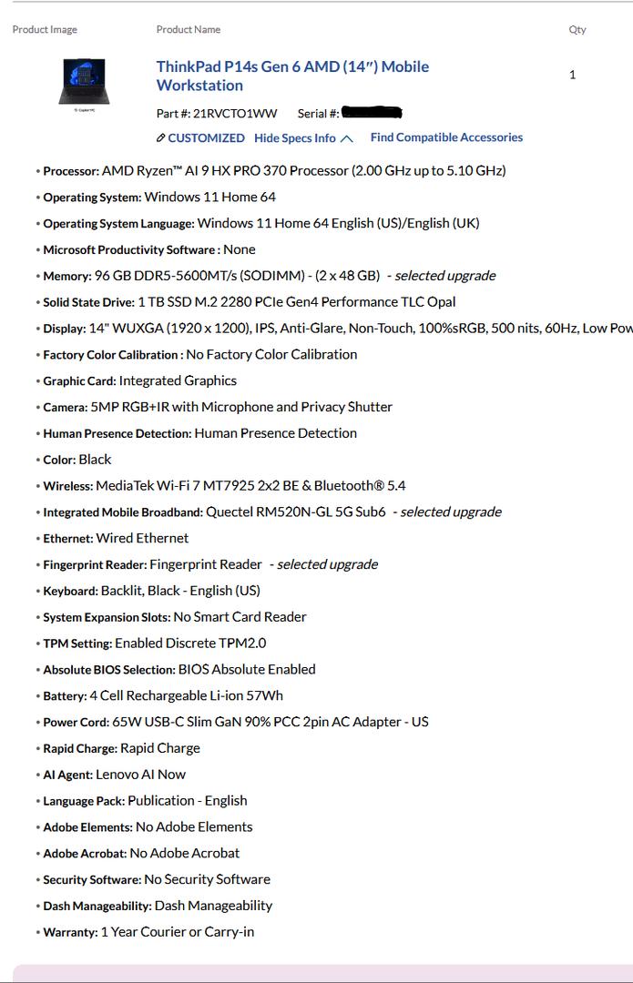 Mint condition high end workstation. P14S Gen 6 - lots of DDR5 RAM: 96GB, fast AMD Ryzen AI 9 HX Pro 370 Process. Purchased in July 2025 - with 4Y Premier Support Plus upgrade from 1Y Courier/Carry-in - Includes original Lenovo box, power supply and accessories