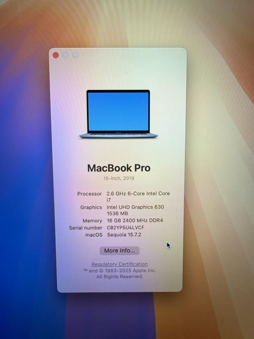 MacBook Pro 15" 2019/16GB RAM/256GB SSD/Good Battery/Fully Functional/Latest MacOS Sequoia Pre-insta