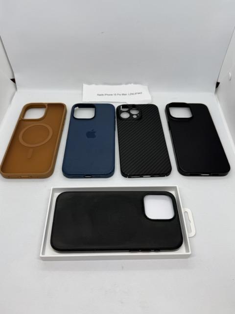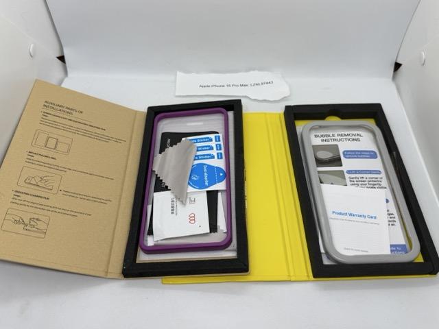 In great condition. Always been in a case and always had a screen protector on it. Includes genuine Apple FineWoven case (has a little wear, see photos), a genuine Apple silicone case (also has a bit of wear), 3 additional cases, 2 privacy glass screen protectors, and 1 privacy/mirrored glass screen protector. Original Apple woven type-C charging cable is included, brand new and unused. Comes in original Apple box. The FineWoven case also comes in its own original Apple box.