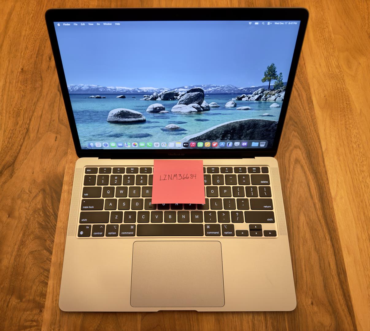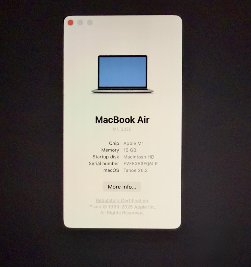 2020 13” MacBook Air with Apple M1 chip, 16GB unified memory, and 256GB SSD.
