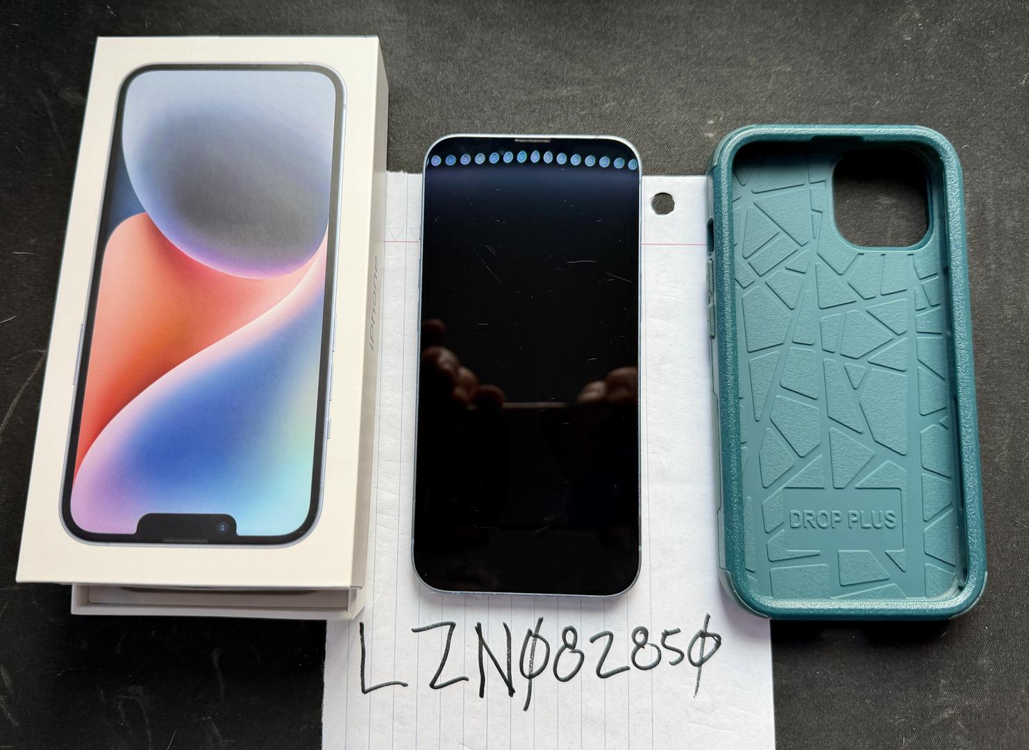 This is an unlocked Apple iPhone 14 (Model A2649) in Blue with 128GB of storage. The phone is in very good condition with a few scuff marks on the screen.
