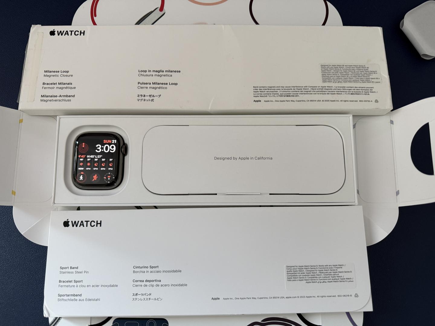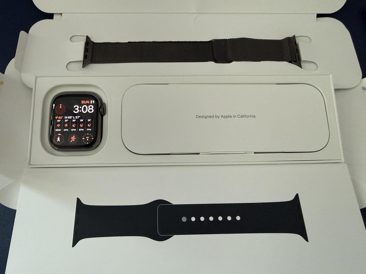 Selling a mint condition - no scratches/marks - like new - Apple Watch Series 9 45mm Stainless Steel with original new in box Sport Band and extra original Apple Milanese band!