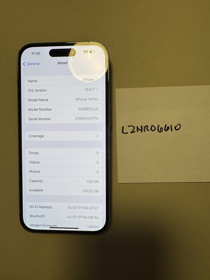 Selling an iPhone 14 Pro (128GB, Silver, model A2650). Factory unlocked and works on all carriers. Battery health is 94%.