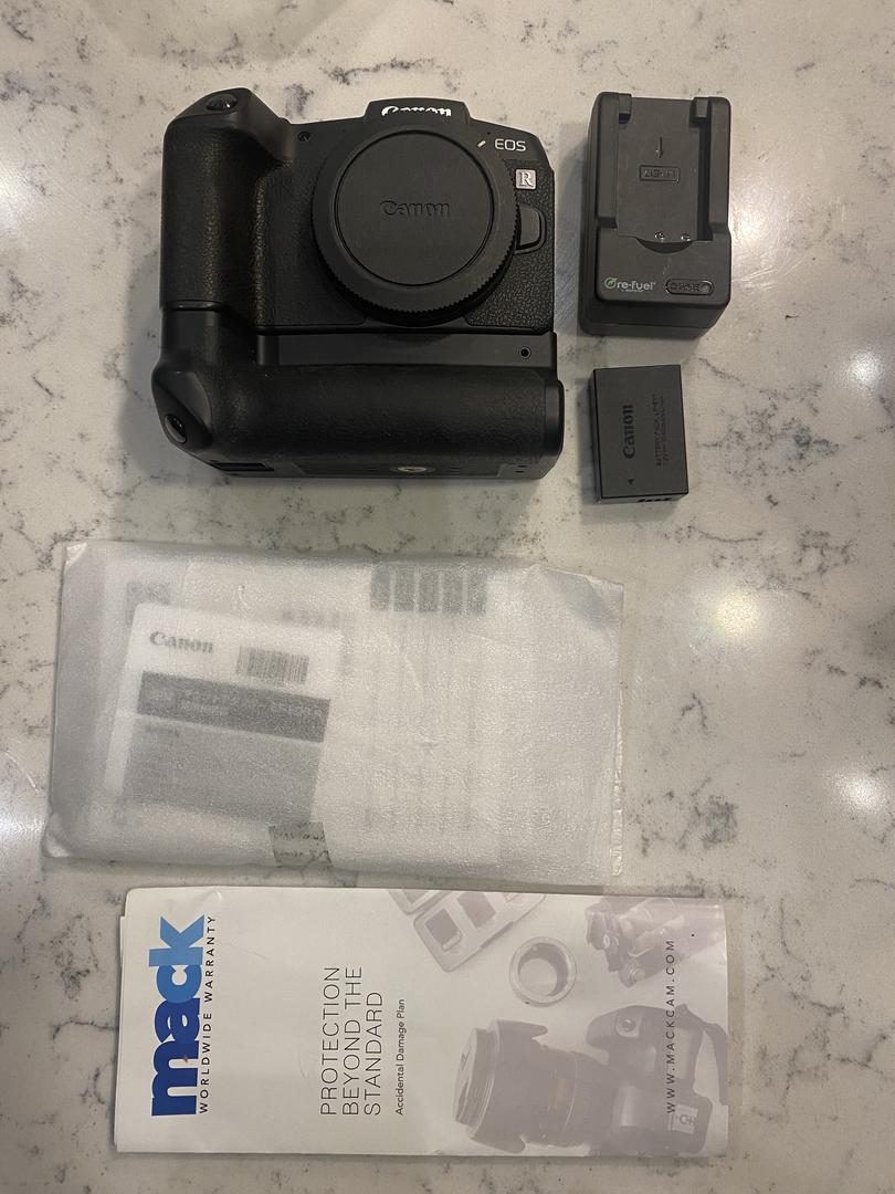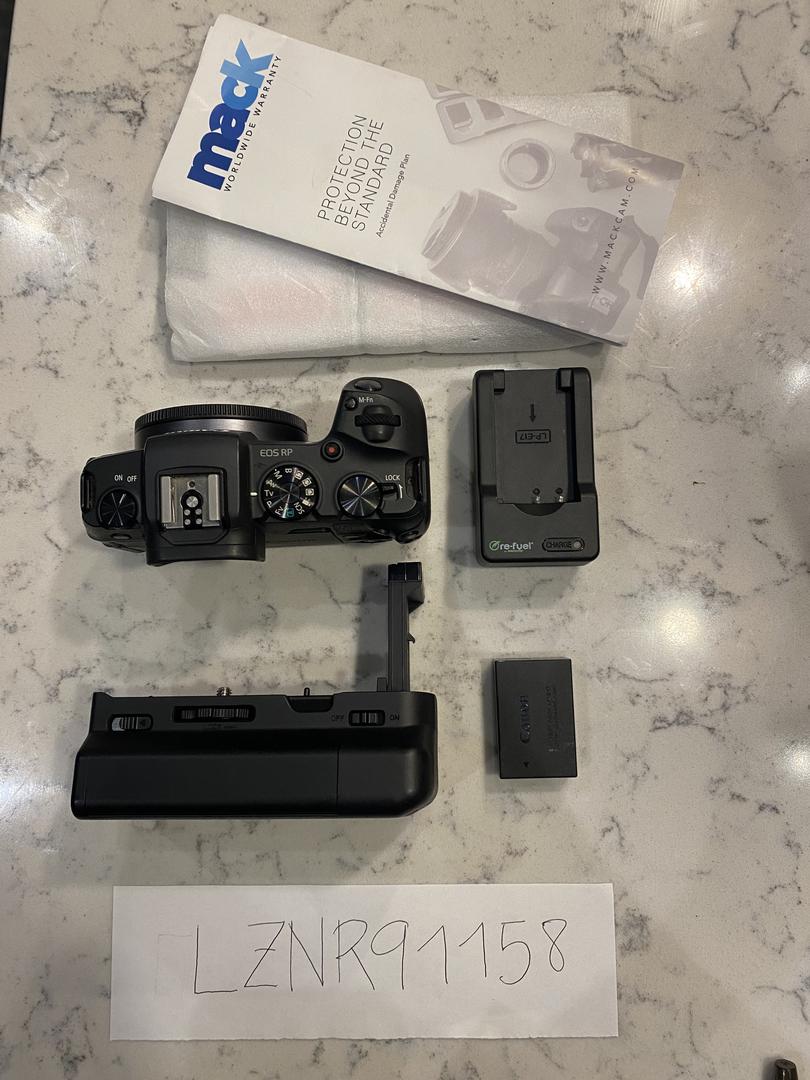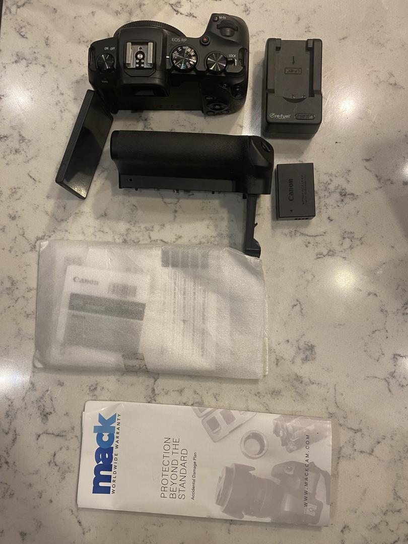 Selling Canon RP with battery charger, battery pack LP-E17, battery grip Newmowa. Used for only two months while my regular camera was being repaired; includes a 1-year warranty (until October 2026) and all paperwork to register the camera with canon.