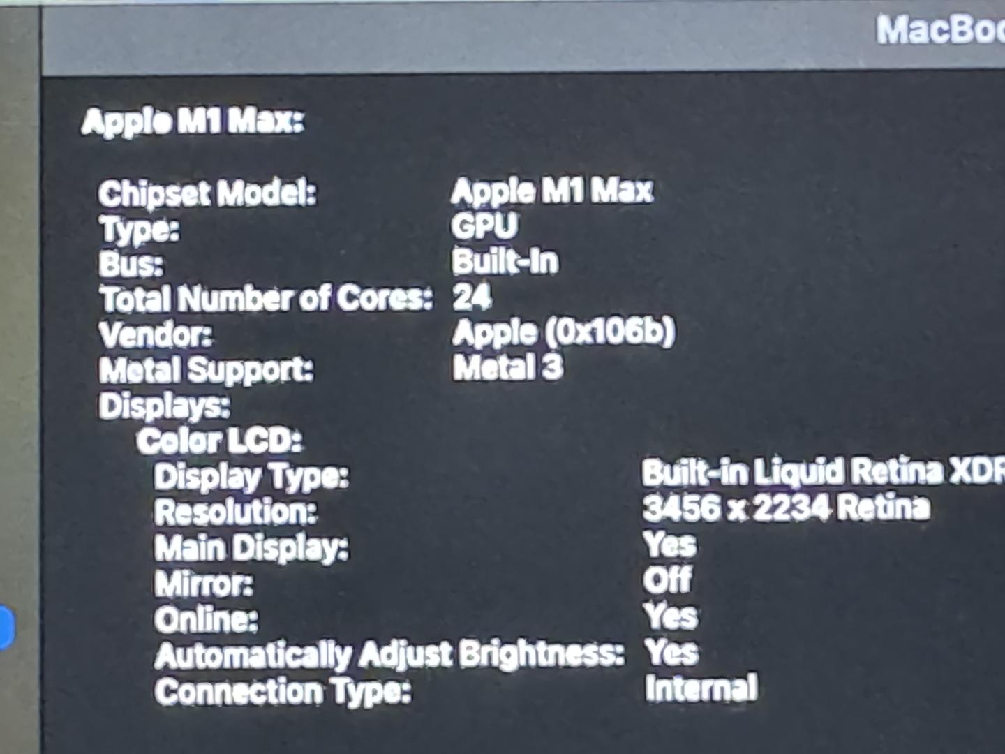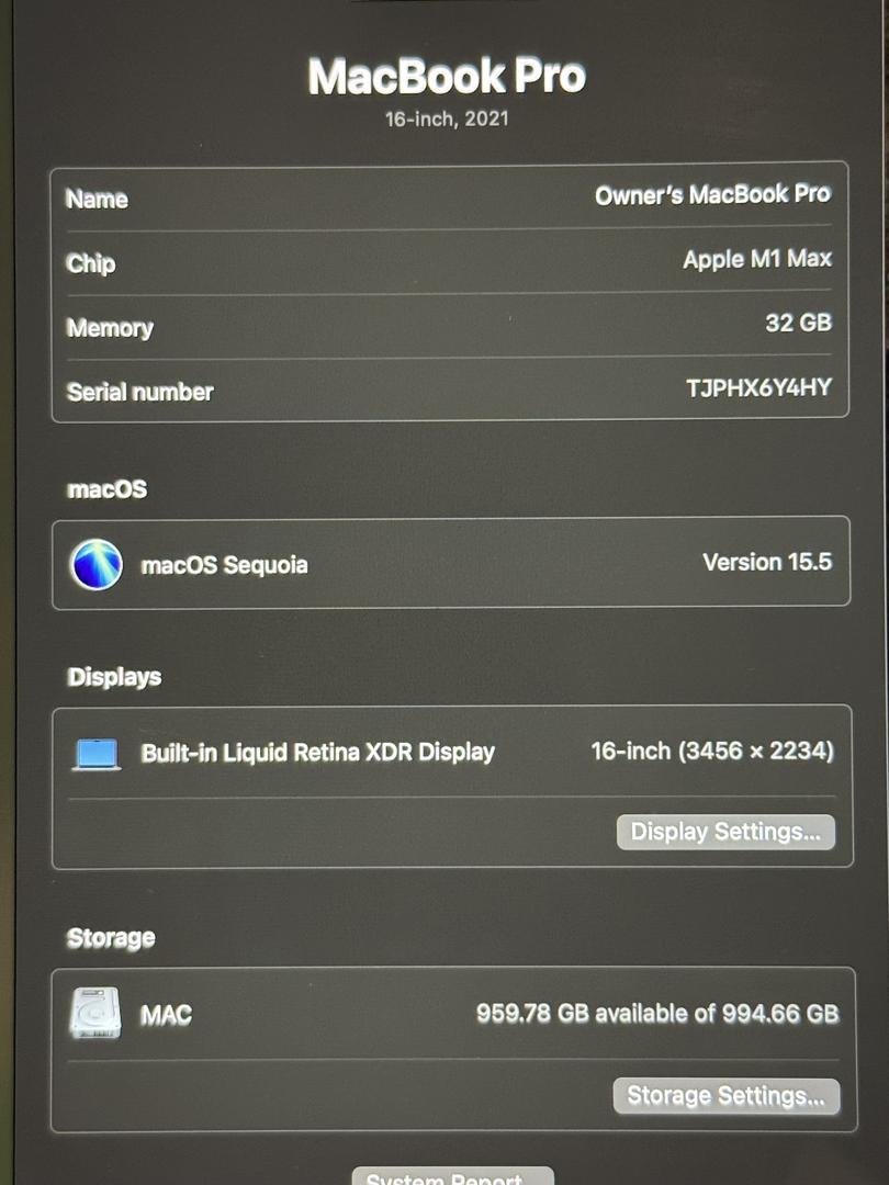 Gently used M1 MacBook Pro with powerhouse 10-core M1 Max cpu 24-core gpu 32gb RAM 1TB storage. Normal battery with 91cc. Cosmetic dent on lcd top cover otherwise excellent condition. Operationally without issues, iCloud free and clear. Comes with charger and cord.