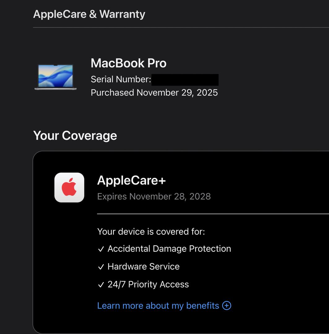 Thanks for uploading the AppleCare+ coverage screenshot (shows active through Nov 28, 2028). Appreciate the confirmation on insured shipping + signature and tracking.