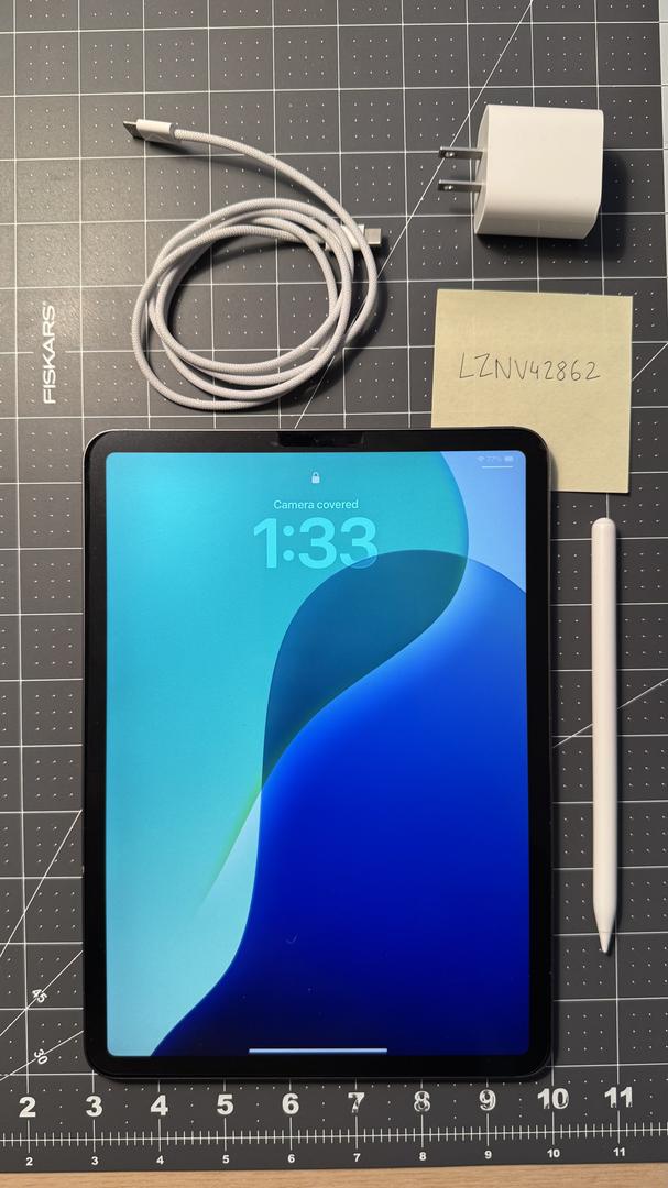 iPad Pro 2020 - screen in pristine condition, minor chips in frame. Includes compatible Apple Pencil, charging brick, and braided USB-C cable.