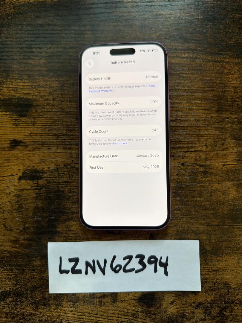 The phone is in good condition . The screen is excellent. The frame does have a number of marks/dings though . Battery health is 99%. Unlocked for any carrier and has all original parts. It was not repaired or refurbished. It is currently running iOS 26.0 and is under apple‘s factory warranty until May 14th 2026