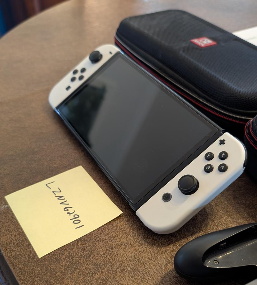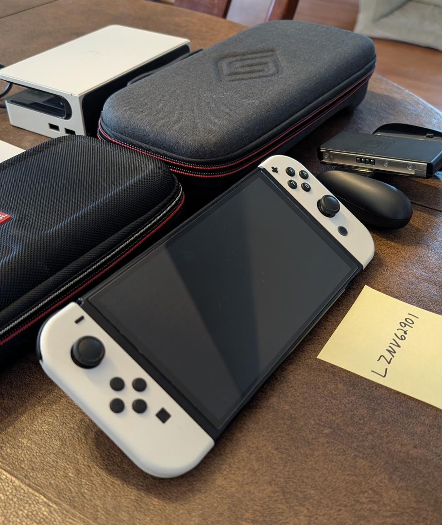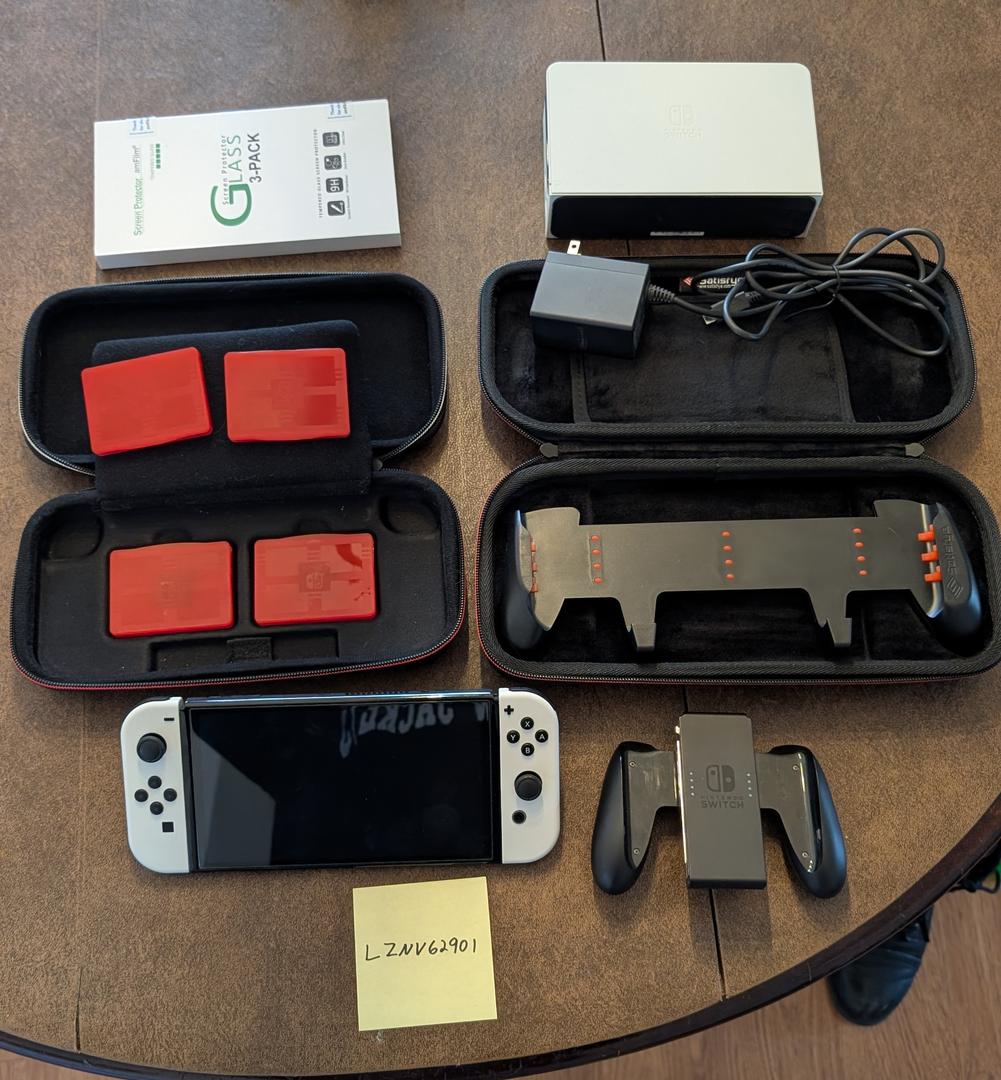 Nintendo switch OLED with white joy-cons, joy-con grip, Nintendo carrying case (with game cases), white Switch OLED dock, power adapter, extra screen protector, satisfye gaming grip, and satisfye case.