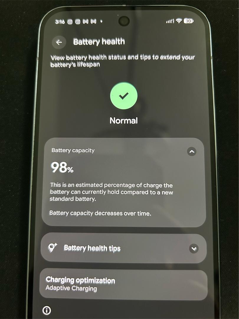 • Battery Health: Excellent condition with 98% Maximum Capacity (verified in settings).