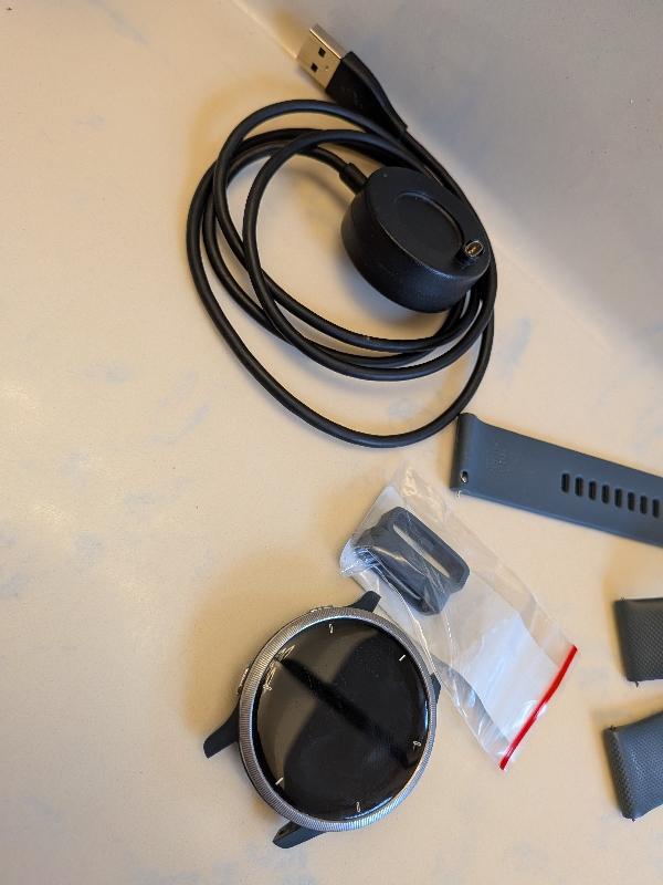 Mint condition Garmin Venu 2 45mm. Always had a screen protector on so the face is in pristine condition. Slate gray. Includes extra band, extra loops, screen protectors, and two charging cables (only one shown but they are identical). The battery still holds a strong multi-day charge, up to a week if only used for basic watch and and smart features.