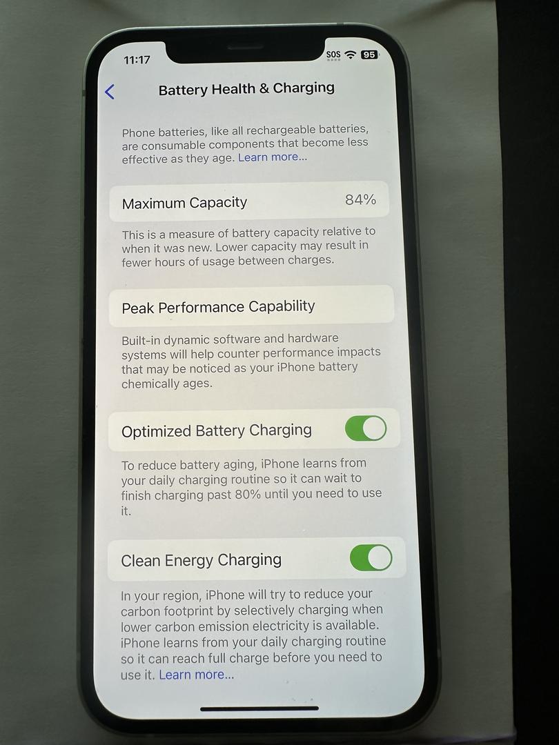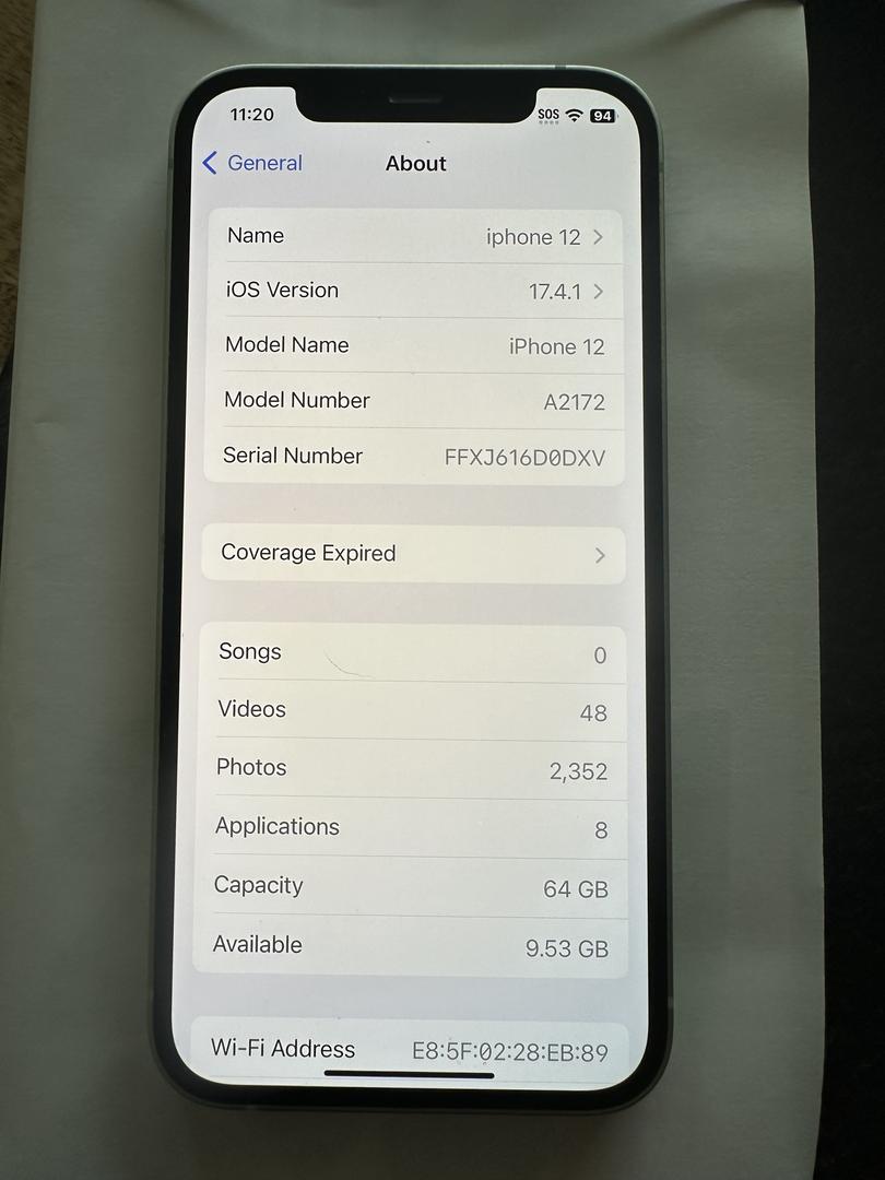 Device: Mint iPhone 12, Storage: 64GB, Carrier: Unlocked, Model: A2172 (U.S.), Color: Green, Battery health: 84%, Unlocked / iCloud signed out / Clean IMEI