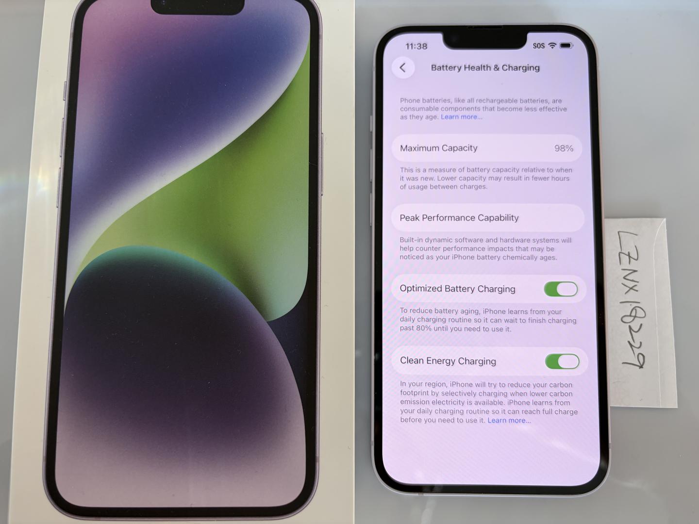 Battery health is at 98%. The phone was lightly used as a secondary device, purchased from an Apple Store, and all parts are original. There are a few minor scratches on the front screen, barely noticeable.