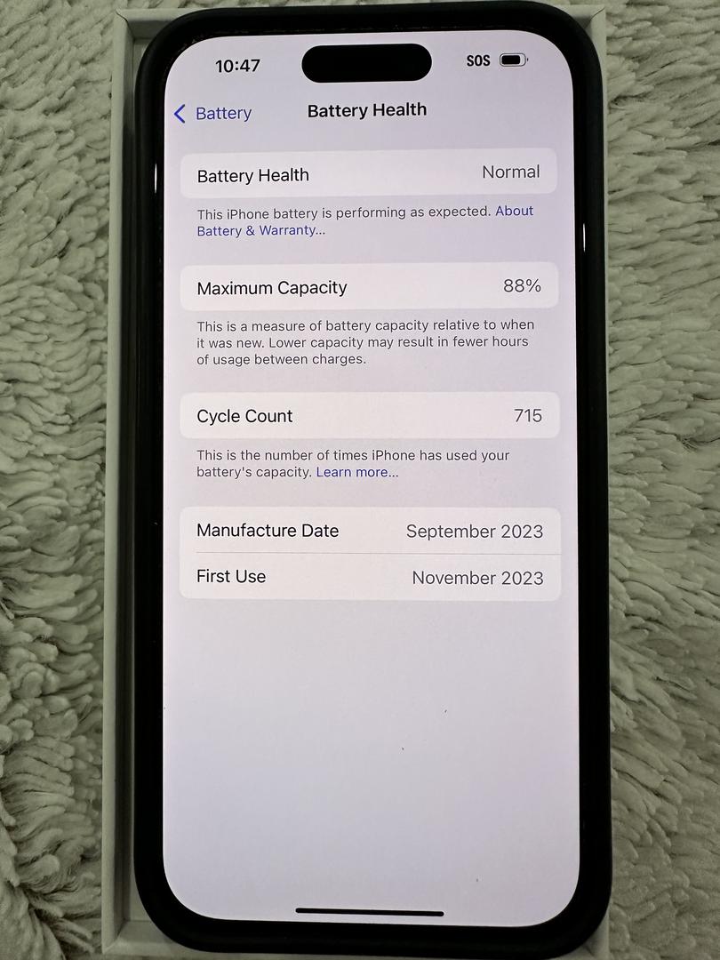 Iphone 15 pro blue. Excellent condition with no visible signs of wear or use. Battery capacity says 88%. Charger is not included but will include a clean lightly used case incase it wanted.