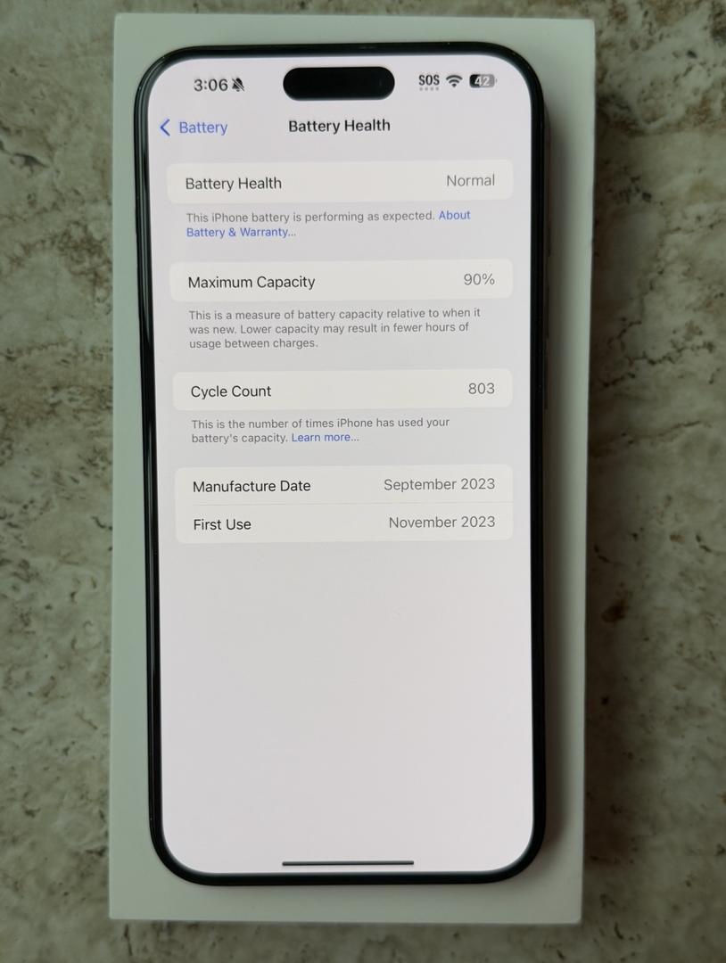 Device is in excellent overall condition. Screen and camera lenses are clean with no cracks or deep scratches. There are a few very small, light hairline scuffs on the titanium frame that are only noticeable under close inspection or certain lighting.