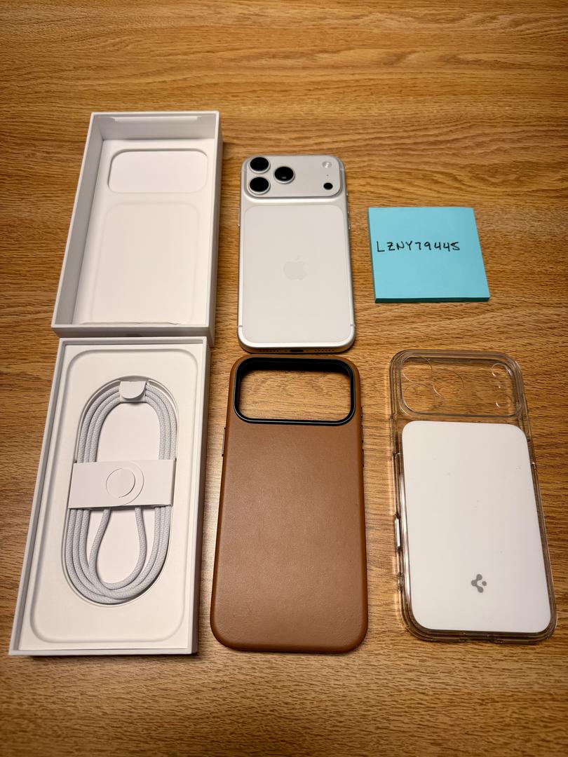 Mint condition iPhone 17 Pro Max unlocked in silver, 512gb storage. There are no blemishes on the device, includes original box and unused charging cable.