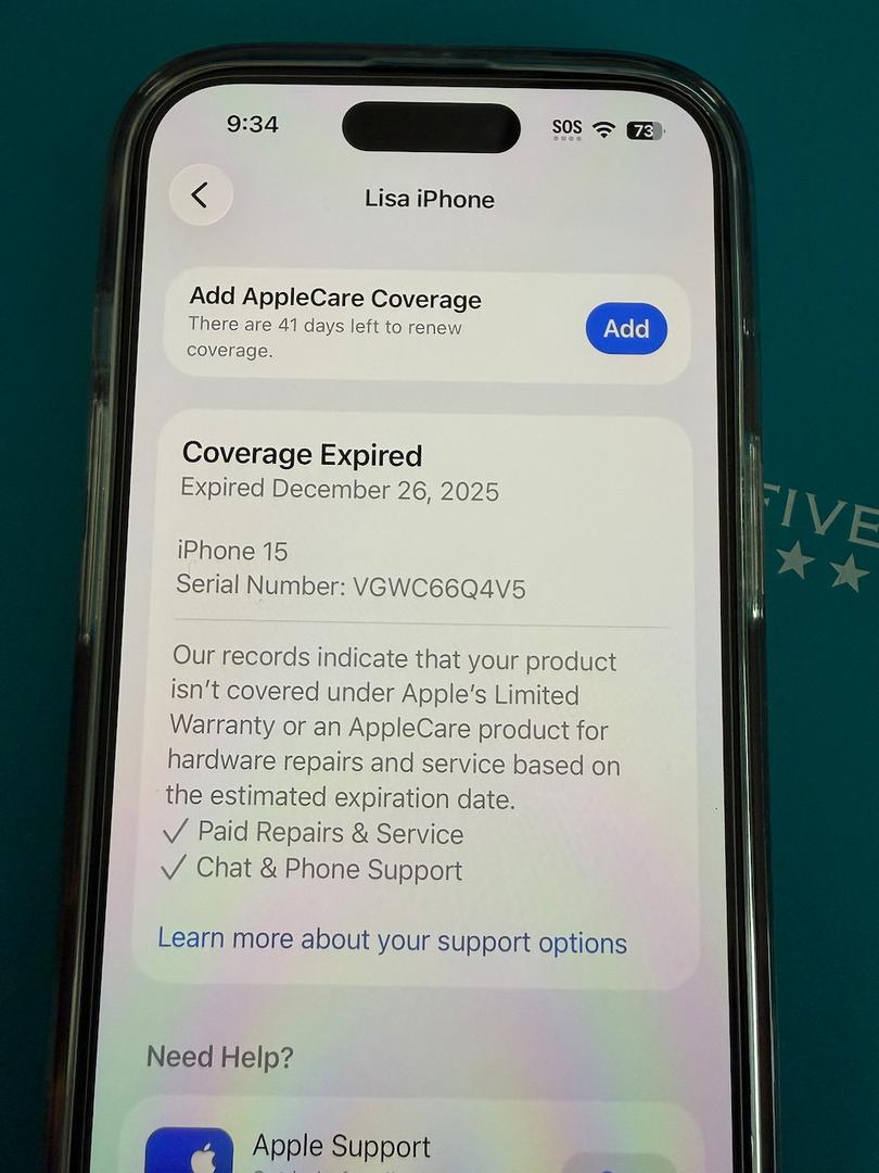Battery is 100% and the phone is elegible to renew Applecare+ if desired.