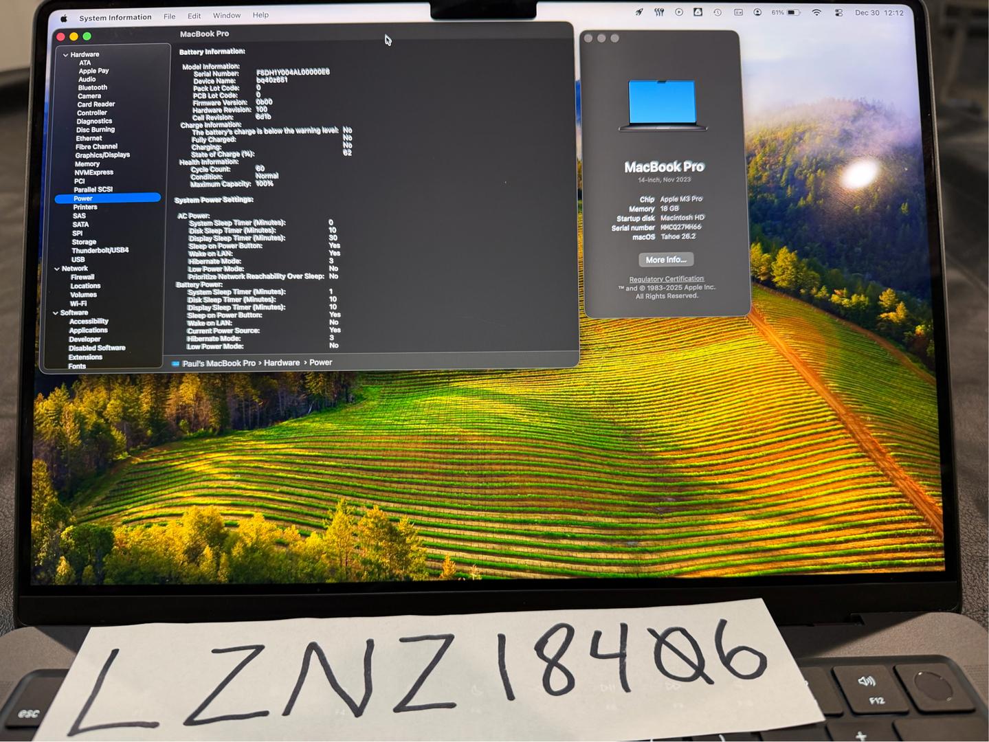 Barely used MacBook Pro. The battery cycle count will show that as it is still at 100% health with 60 total cycles.