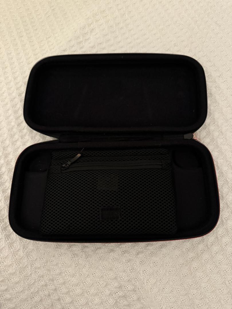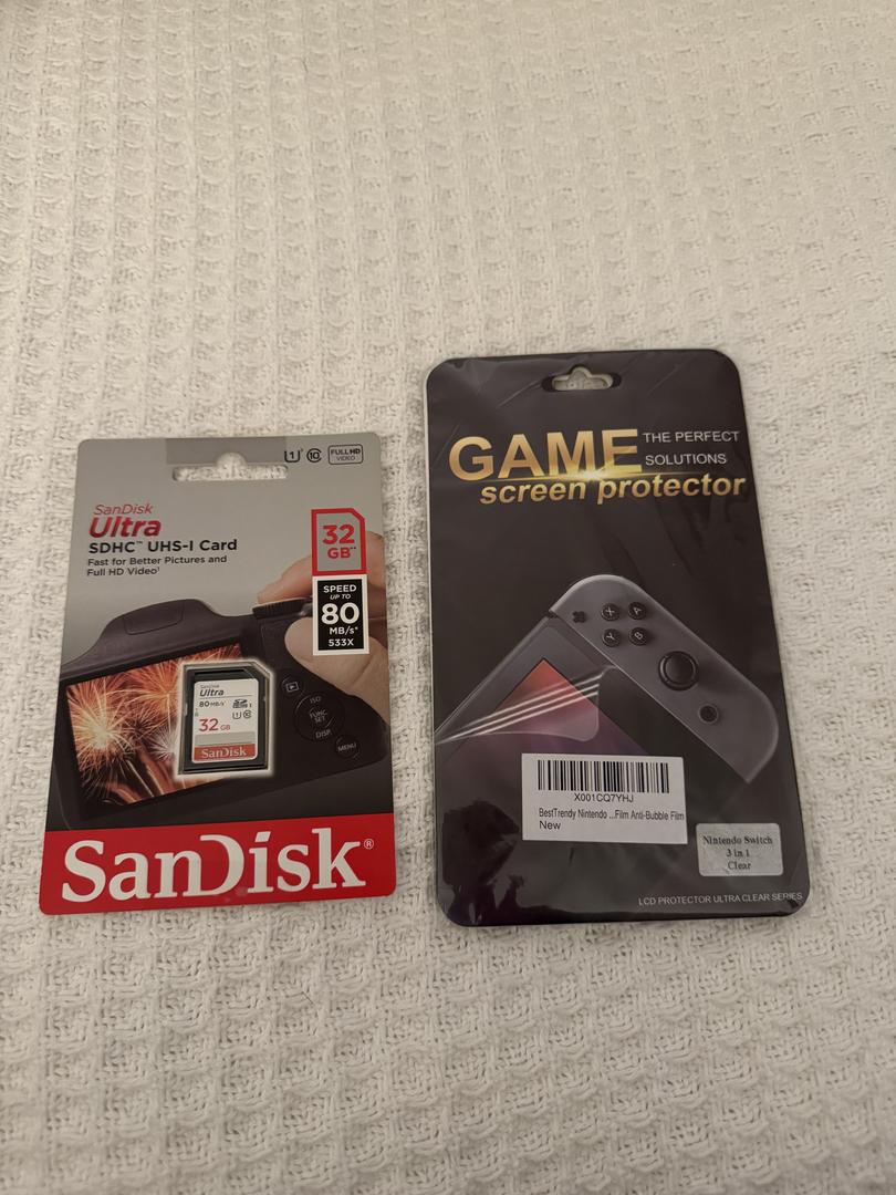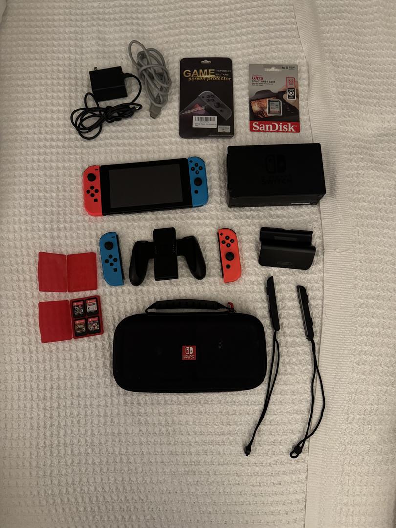 This listing includes ALL the extras! A screen protector, storage card, travel case, 4 games, charging port, power cord, HDMI cord, two extra controllers, and a stand.