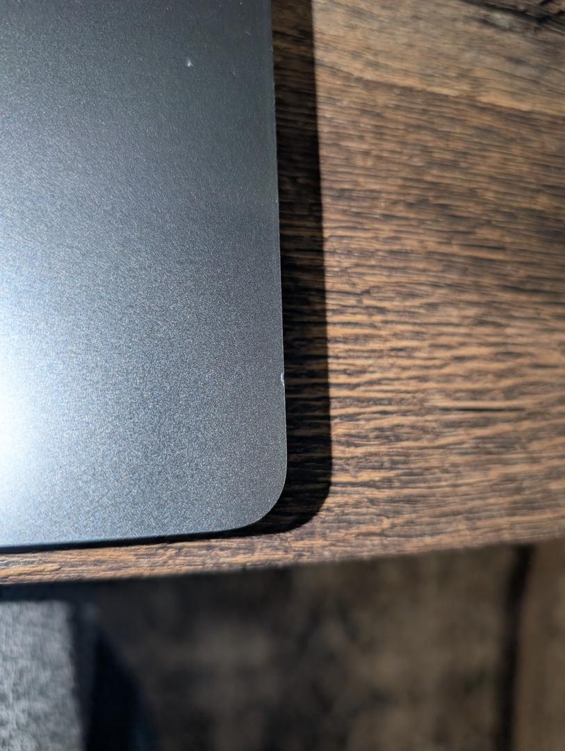 A tiny superficial cosmetic imperfection in the metal casing on the right case edge.